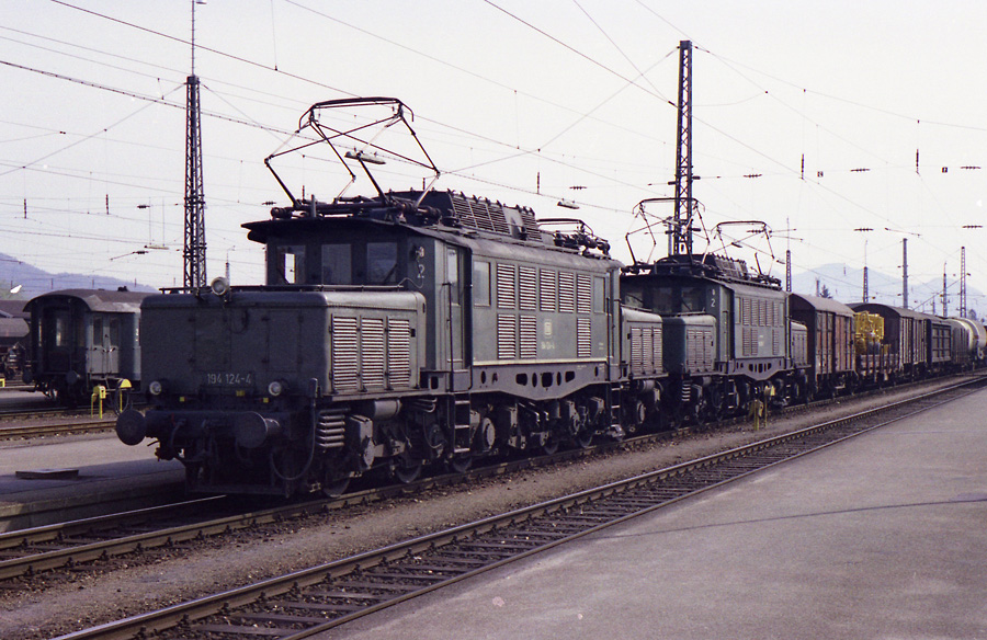 Aus Österreich kommend durchfährt die 194 124-4 am 30. März 1978 zusammen mit einer Schwesterlokomotive den Bahnhof Freilassing auf der Fahrt in Richtung München. Die 194 124 war am 17.12 1943 fabrikneu beim Bw Kornwestheim stationiert worden und nach Zwischenstationen in Ulm (1951-55), Heidelberg (1955/56), Augsburg (1956-70), Mannheim (1970/71) und nochmals Augsburg (1971-1974) seit dem 26. Mai 1974 in Freilassing beheimatet. Dort erhielt sie auch den "Ralleystreifen", den sie bis zu ihrer Ausmusterung im Jahr 1988 trug. Foto: Günter Hoppe |