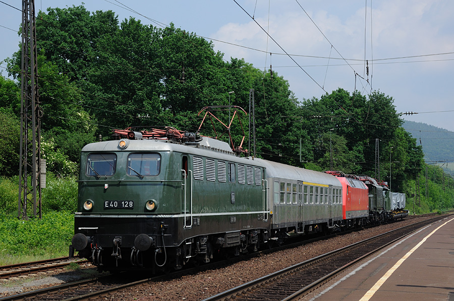 Nach einer Übernachtung in Nürnberg und der Aufnahme der 120 004, der E 69 02 und des auf Tiefladewagen verladenen Adlerzuges ging es am 30. Mai 2012 weiter nach Koblenz-Lützel. Im Bahnhof Laufach musste für die Überholung durch einen ICE ein Zwischenhalt eingelegt werden. Foto: Joachim Hund |