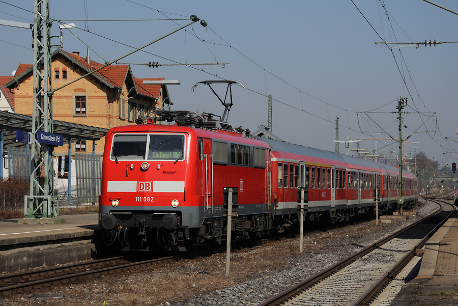 Mit einem Regionalexpress nach Stuttgart Hbf rauscht die 111 082 am 16. März 2012 durch den Kornwestheimer Personenbahnhof.