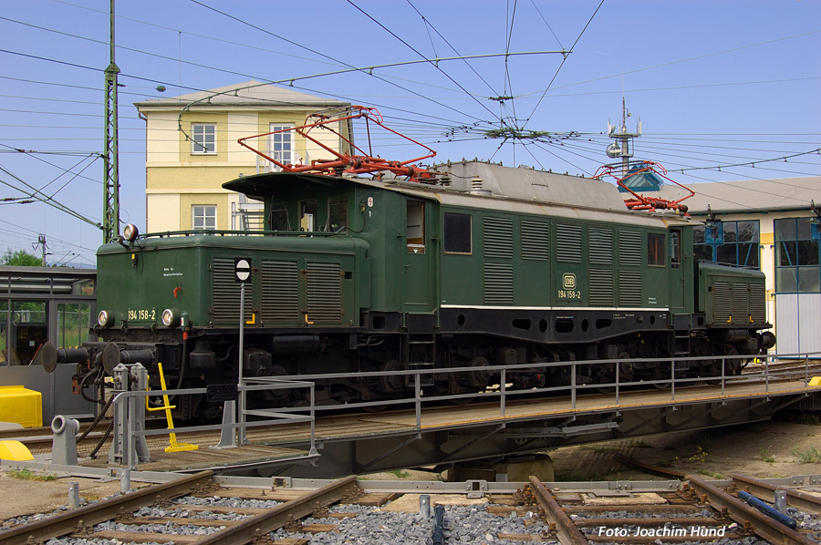 Als der Hauptschalter der 194 158 am 29. Mai 1988 gegen 15.30 Uhr ausgeschaltet wurde, endete damit der Planeinsatz der Baureihe E 94 bei der Deutschen Bundesbahn. Bis 1992 war die Maschine im AW Bremen abgestellt und sollte dort eigentlich verschrottet werden. Ein Schrotthändler in Leer kaufte die Lokomotive, so dass sie die nächsten fünf Jahre in Ostfriesland zubrachte. Schließlich erwarb Frau Barbara Pirch die 194 158 mit dem Ziel, die historisch bedeutsame Lokomotive wieder in Betrieb zu setzen. Dies gelang nach jahrelanger mühevoller Kleinarbeit am 20. August 2001. Das Foto zeigt sie anlässlich einer Fotosonderfahrt am 18. Juni 2006 auf der Drehscheibe des ehemaligen Bw Freilassing, welches von 1975 bis 1979 ihre Heimatdienststelle war. Foto: Joachim Hund |